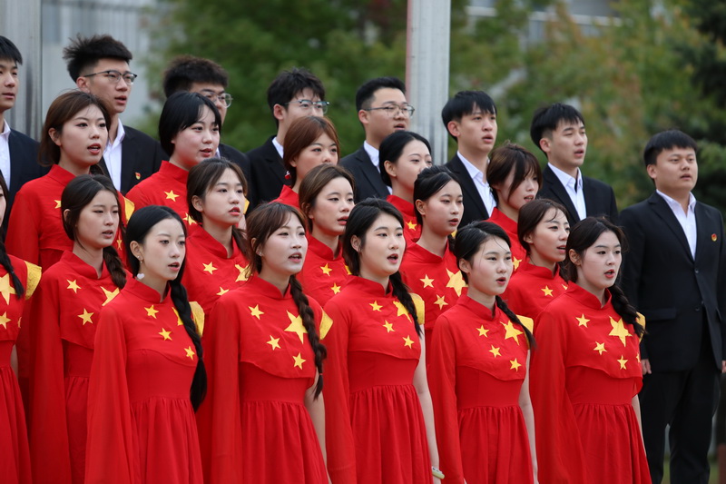 “我爱你中国,亲爱的母亲......”现场全体师生挥舞着手中的国旗,共贺盛世中华,深情唱响《我爱你中国》,共同向祖国“声”情告白,献礼新中国75华诞!