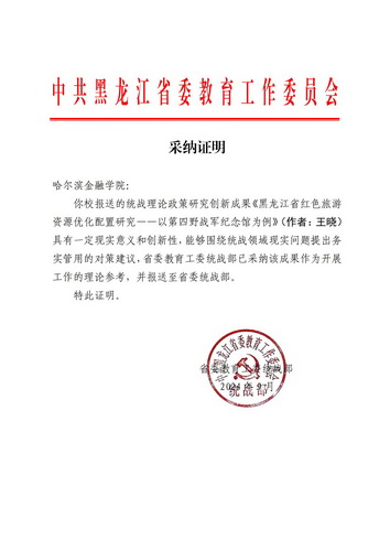 按照上级工作要求部署,我校认真落实做好统战理论政策研究和统战工作实践创新成果报送工作。近日,全省高校共申报了76篇统战理论政策研究和统战工作实践创新成果,经省委教育工委统战部组织专家评审、筛选,评选出36篇成果报送至省委统战部。我校报送的《黑龙江省红色旅游资源优化配置研究——以第四野战军纪念馆为例》(作者:计算机与数学学院 王晓)喜获2024年度全省统战理论政策研究和统战工作实践创新成果并报送省委统战部。专家评审指出,我校报送的统战理论政策研究创新成果具有一定现实意义和创新性,能够围绕统战领域现实问题提出务实管用的对策建议,已采纳该成果作为开展工作的理论参考。